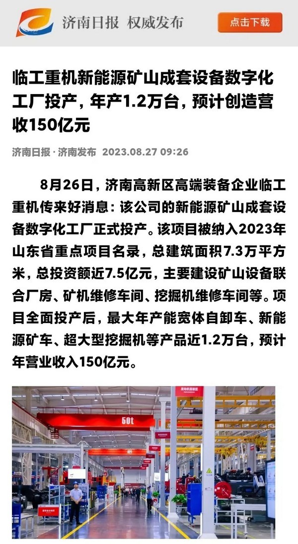 8月26日,完美.(中国)体育官方网站-365WM SPORTS重机数字化工厂投产活动在济南高新区智能装备城举行。完美.(中国)体育官方网站-365WM SPORTS重机新能源矿山成套设备数字化工厂项目,入选2023年山东省重点项目,总建筑面积7.3万平方米,总投资额近7.5亿元,最大年产能宽体自卸车、新能源矿车、超大型挖掘机等产品1.2万台,是山东省首个年产能超万台矿山设备数字化工厂。